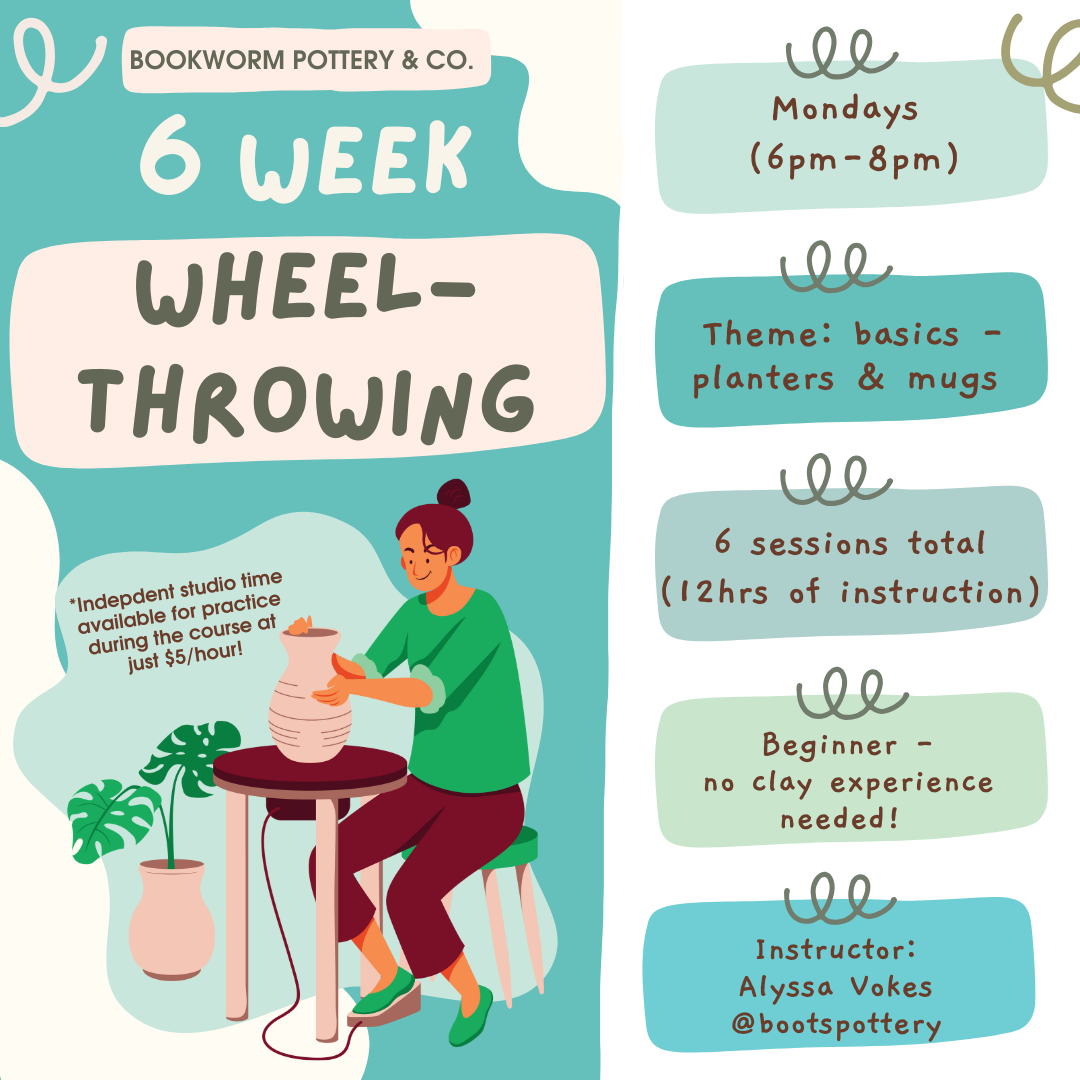 - DISCLAIMERS: YOU MUST SIGN YOUR POTTERY WITH YOUR FULL NAME. Bookworm Pottery & Co. is not liable for lost pieces that are unsigned and mistakenly claimed by another student. Not all practice pieces are guaranteed to make it out of the kiln if instructions are not followed. Inconsistencies in thickness can cause cracks or even shattering in the firing process. Improper glaze application can cause the piece to fuse to the kiln shelf. However, the goal of this course is to learn and have fun, not the finished practice pieces, so don’t stress about it! By purchasing this ticket, you are agreeing that Bookworm Pottery & Co. is not held liable for damaged pieces.
