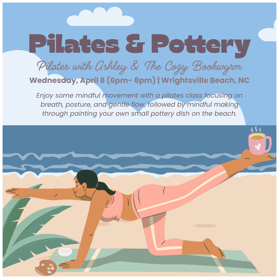 Enjoy some mindful movement in this pilates class focusing on breath, posture, and gentle flow with our collab partner, Pilates with Ashley, followed by mindful making through painting your own small pottery dish on the beach with staff member Gabby from The Cozy Bookwyrm.
