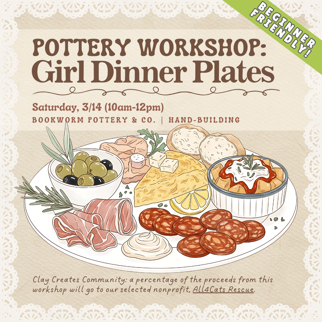 In this pottery workshop, you'll learn how to create ceramic "girl dinner" charcuterie plates from scratch. Enjoy a creative, relaxed outing where you’ll learn the skills to make stoneware creations that can be cherished for years to come! Perfect for families, couples, friends, and solo learners--all are welcome! Adults over the age of 21 can BYOB!