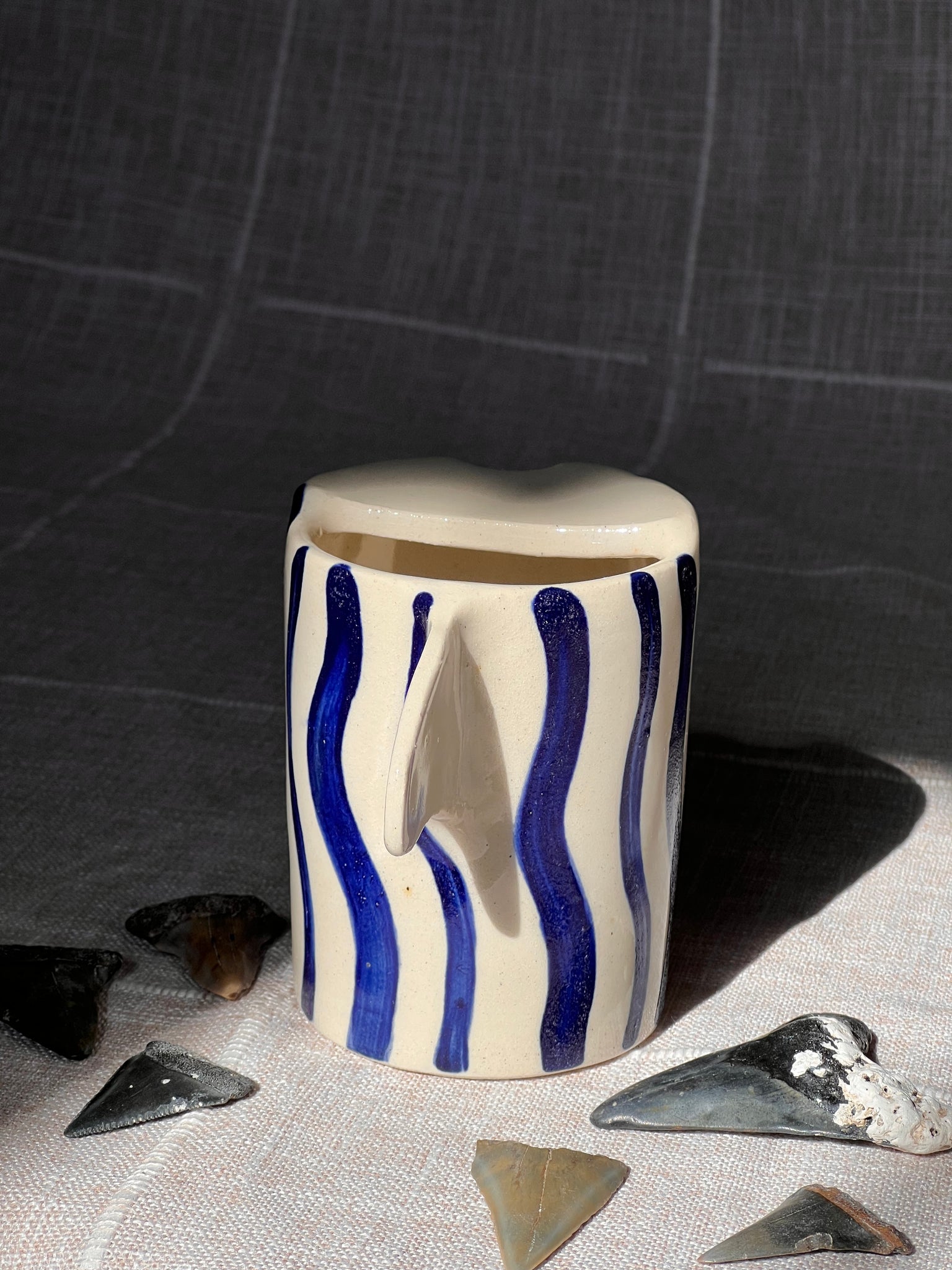 Each piece is handcrafted with love--made entirely by a lil human with hand-painted stripes and a sculpted shark fin, each travel mug is completely unique. My hope is that your new pot will bring you a splash of joy in your day-to-day 🫶