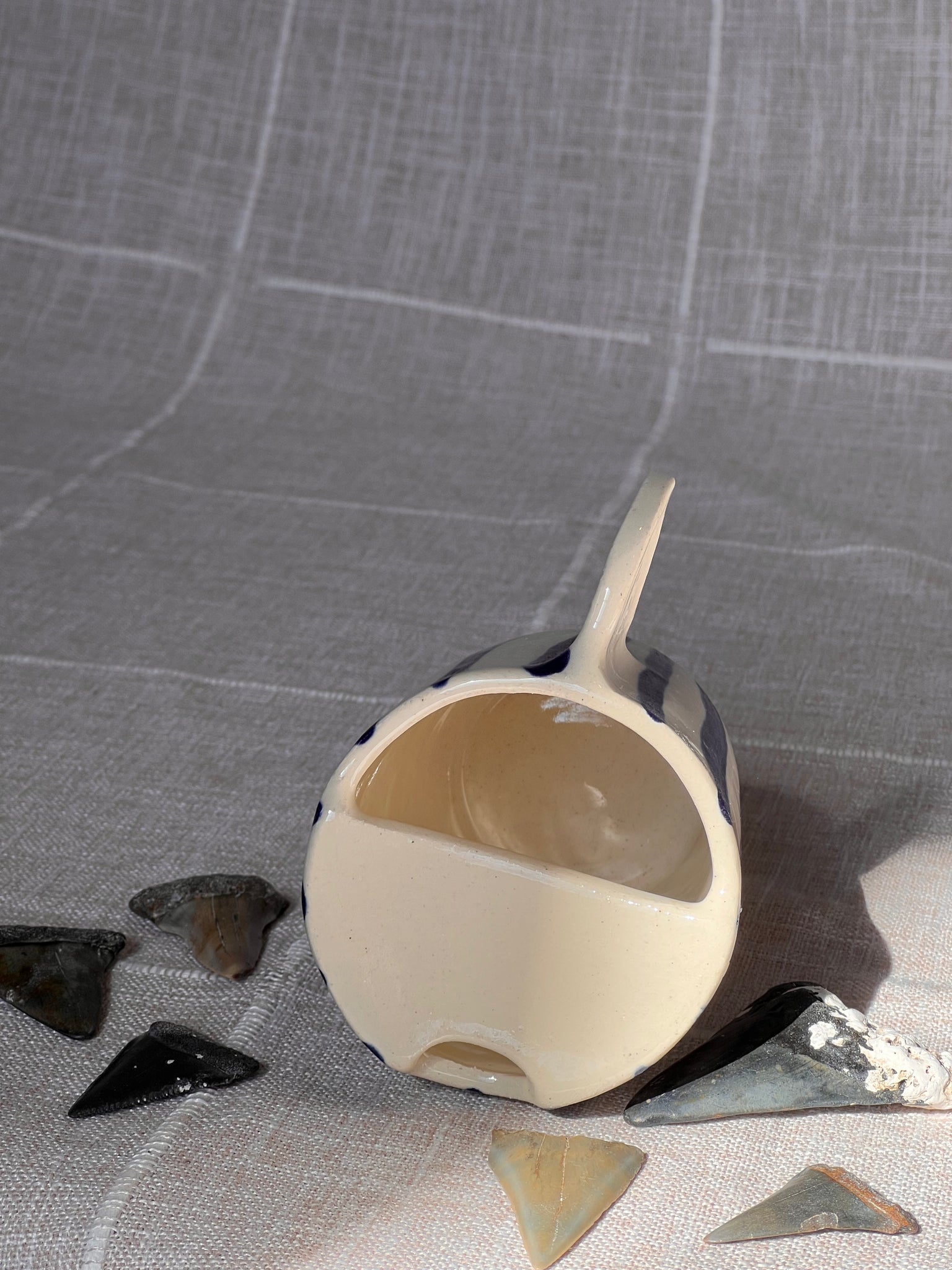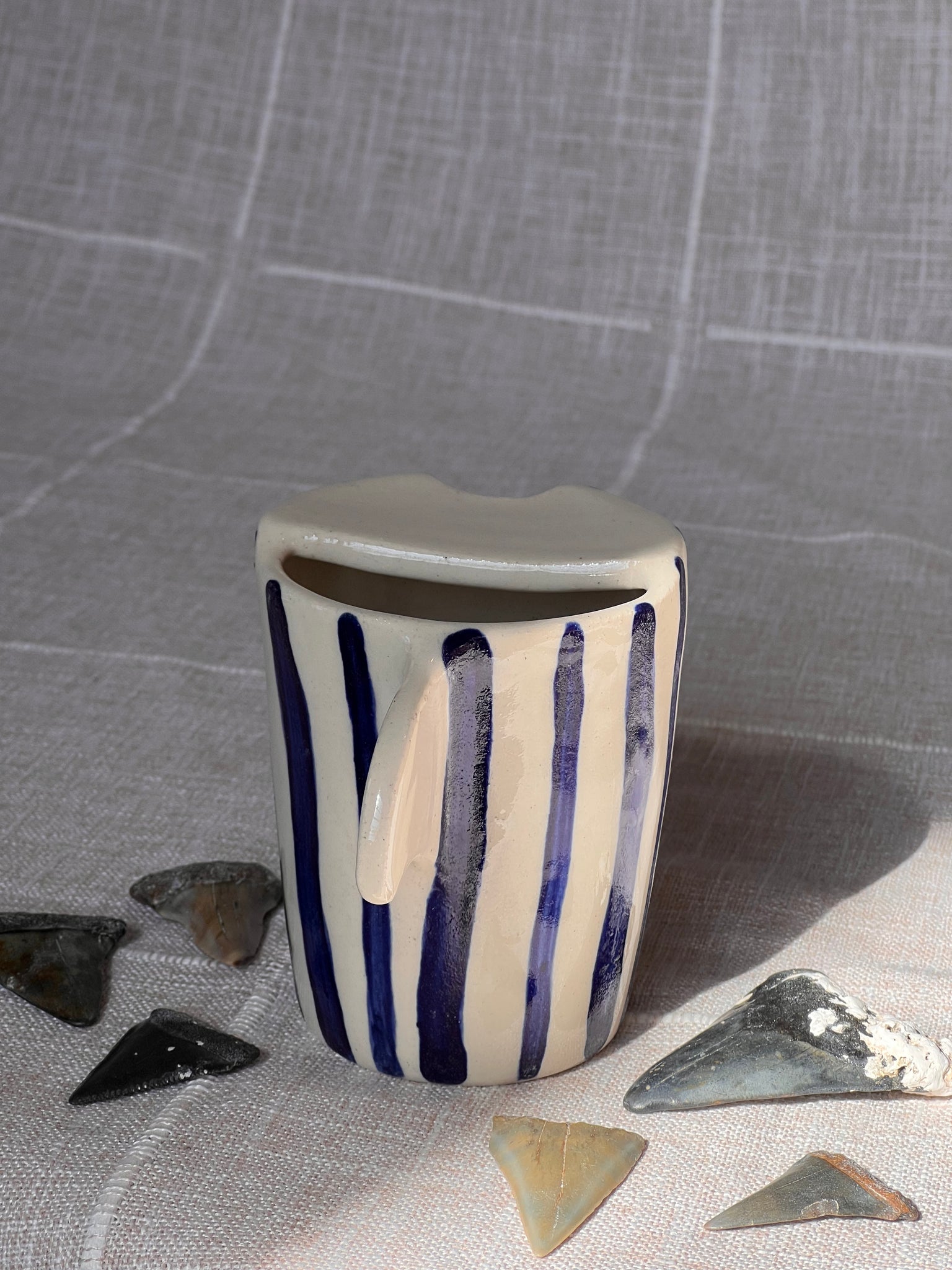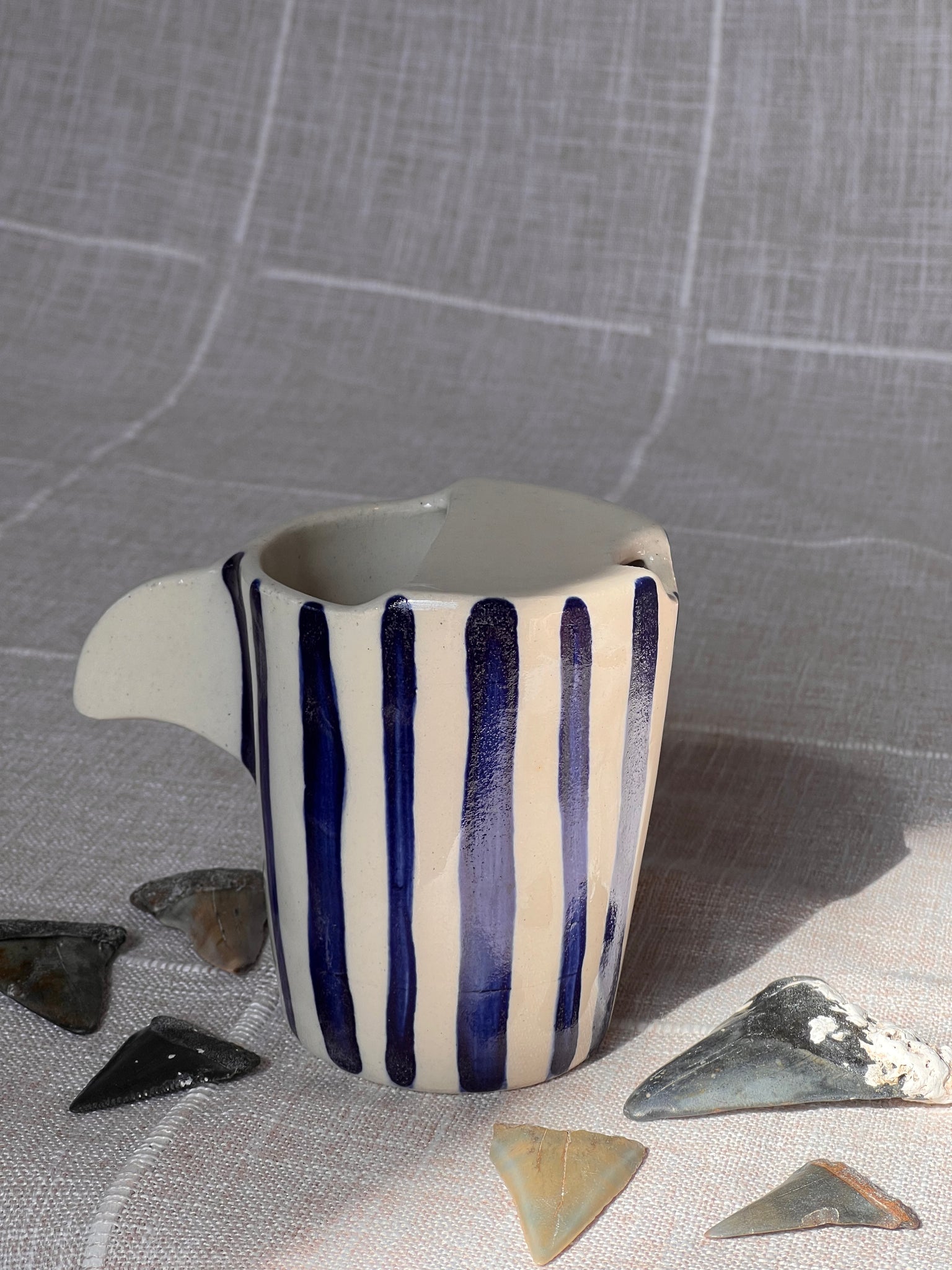 Each piece is handcrafted with love--made entirely by a lil human with hand-painted stripes and a sculpted shark fin, each travel mug is completely unique. My hope is that your new pot will bring you a splash of joy in your day-to-day 🫶